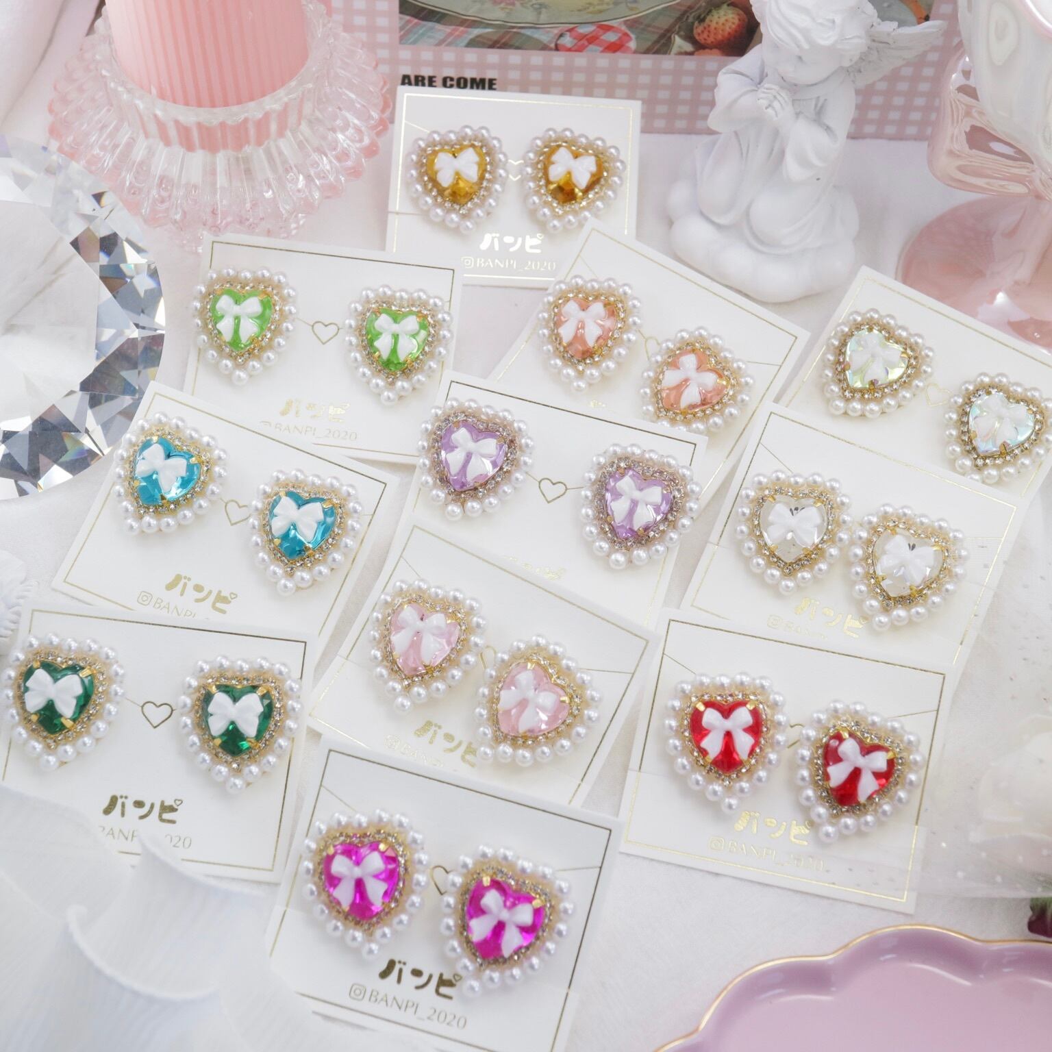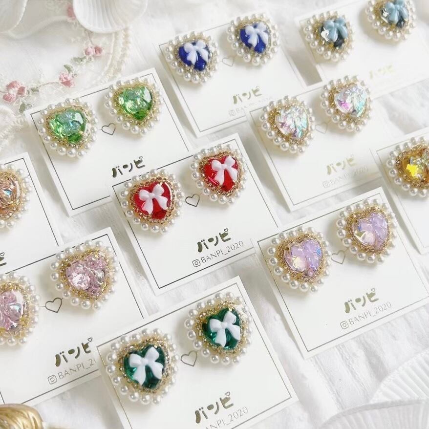 パールハートビジューイヤリング・ディープピンク