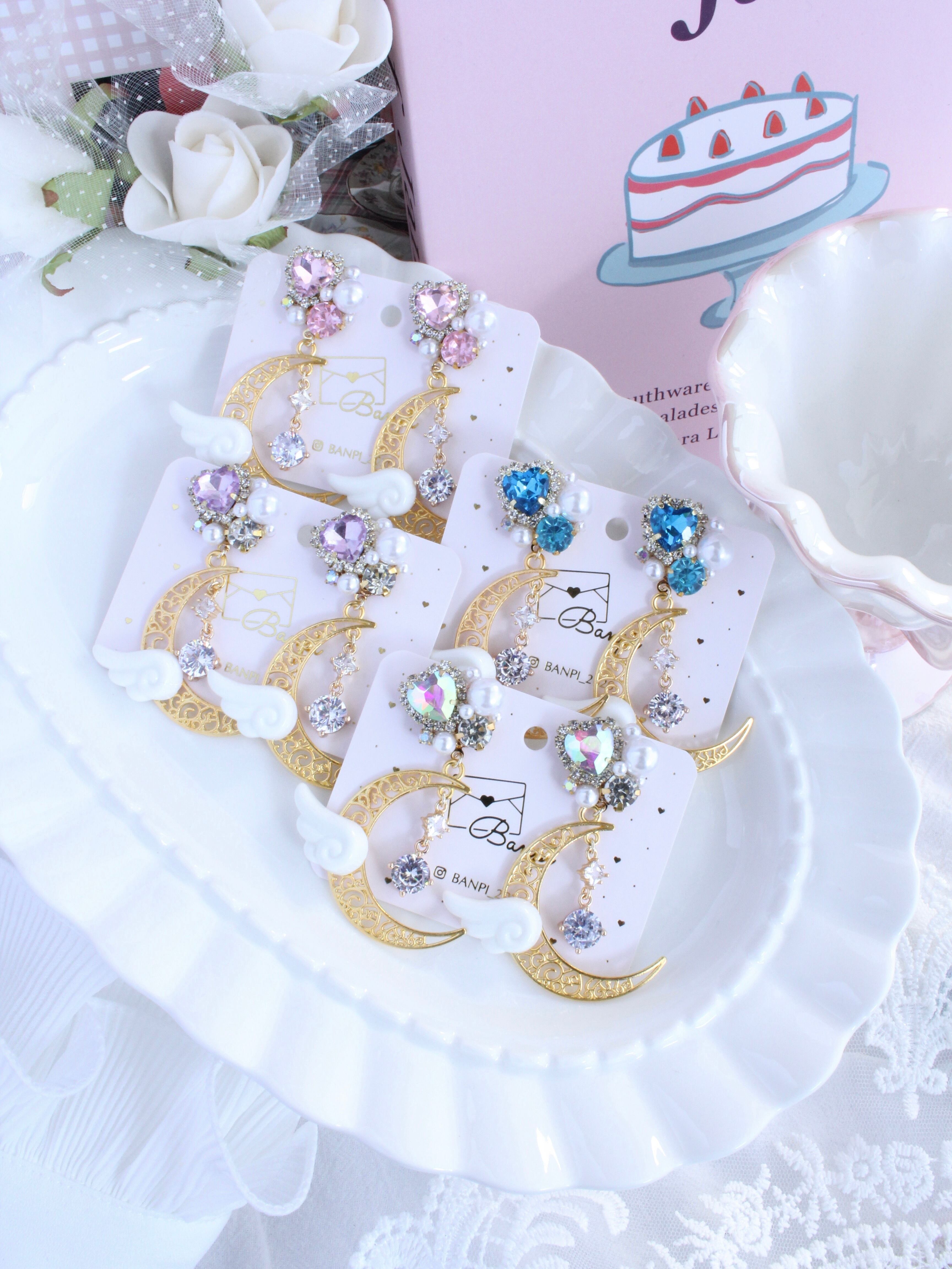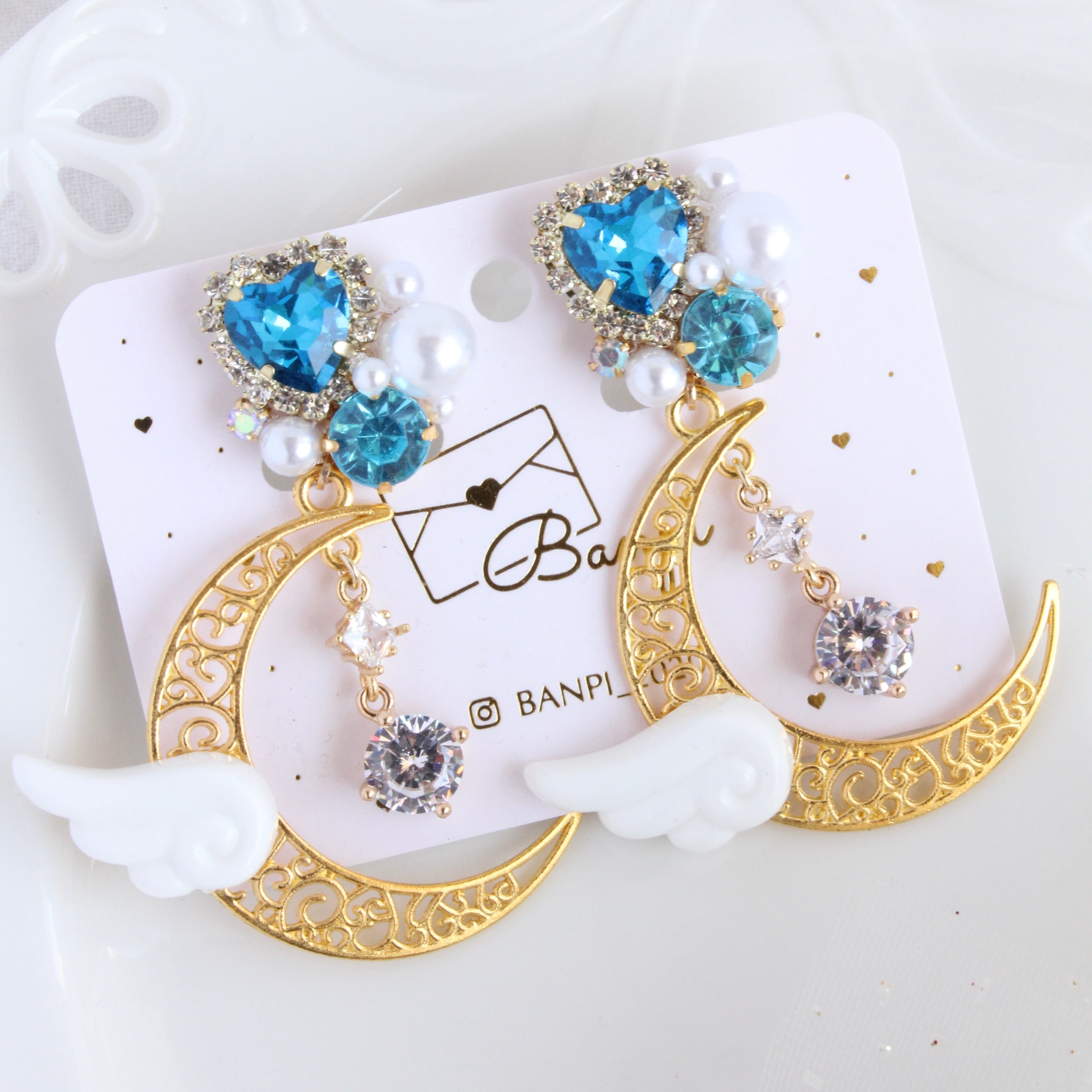 月と天使の羽イヤリング・ブルー