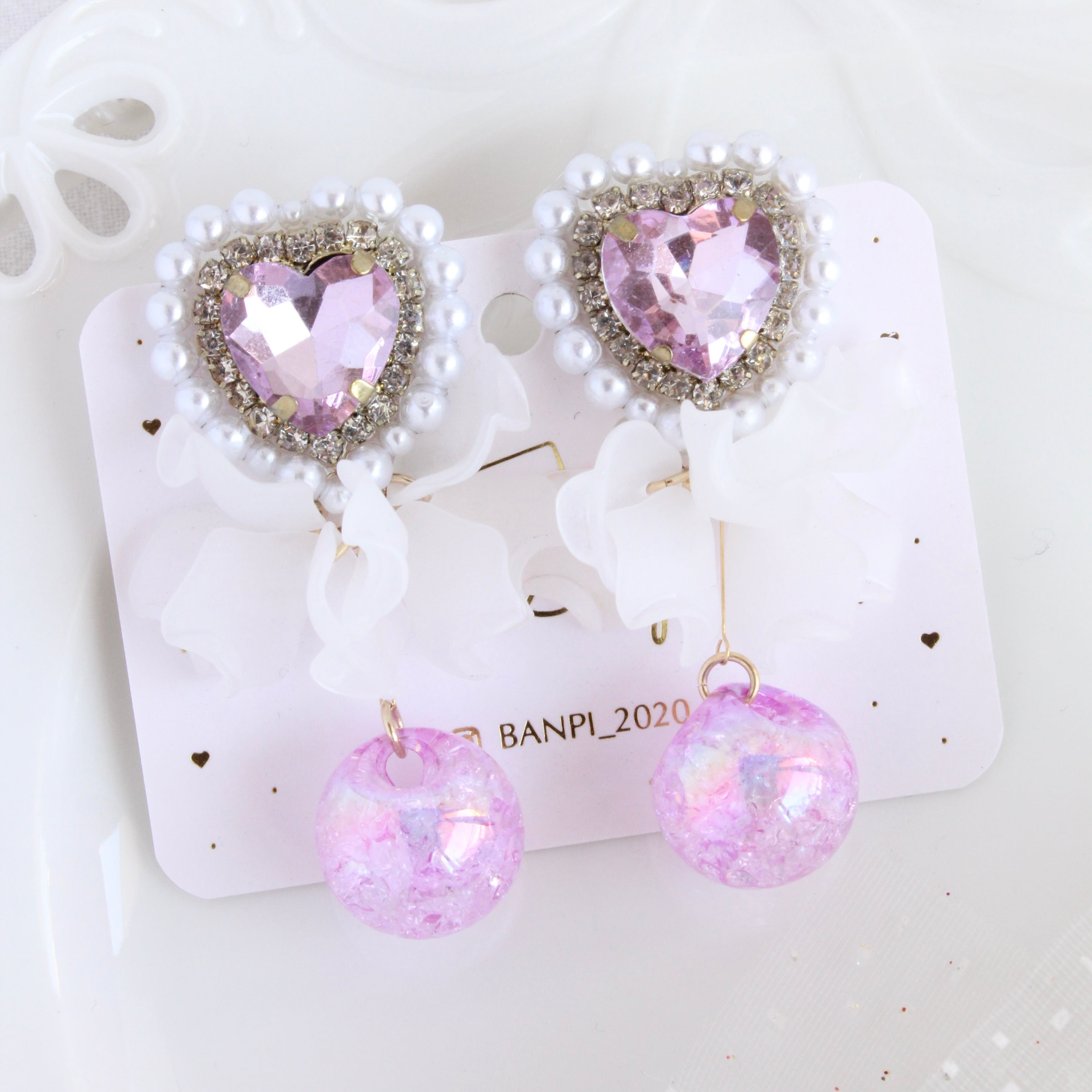 ハートビジュー花びらクラッシュビーズイヤリング・パープル