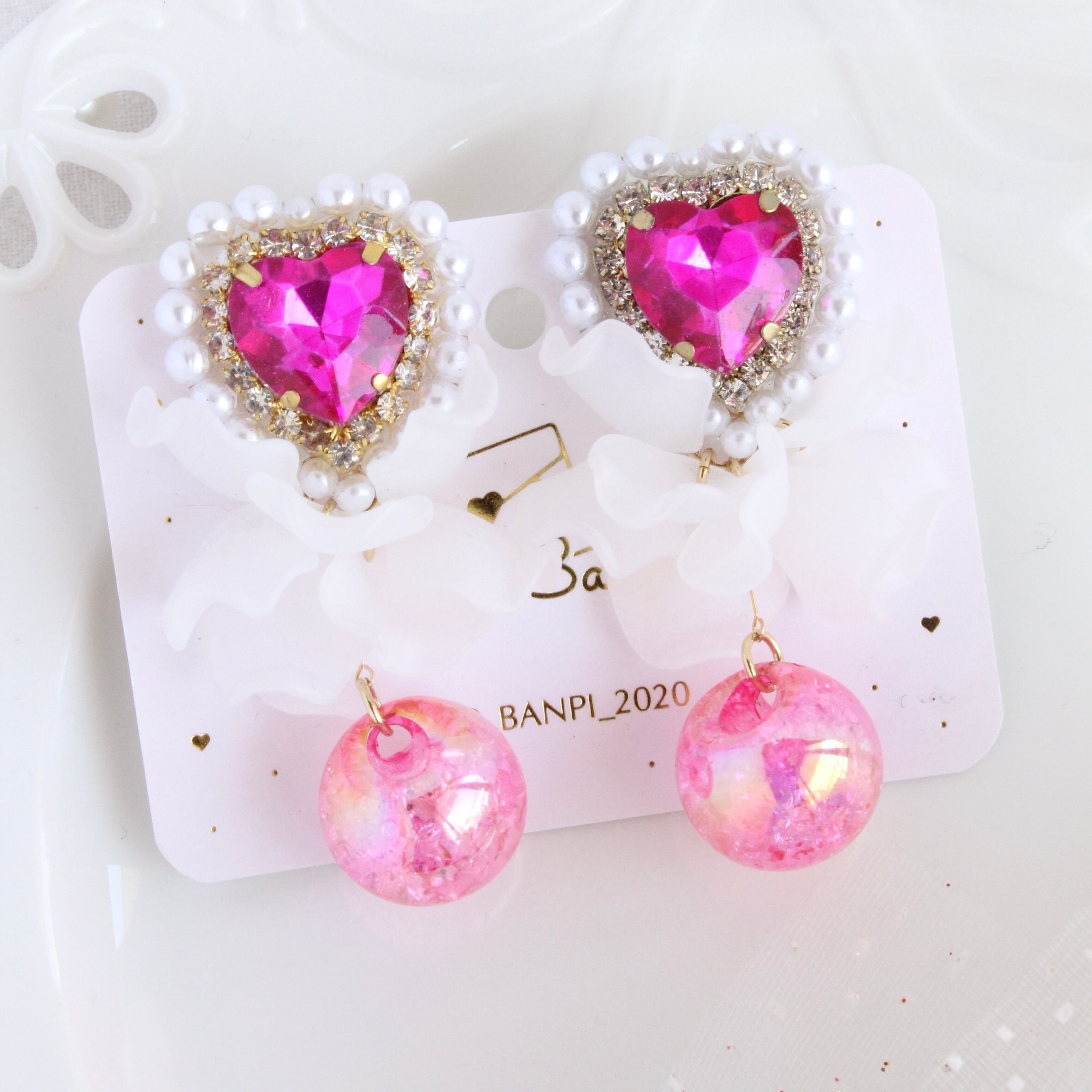 ハートビジュー花びらクラッシュビーズイヤリング・ディープピンク