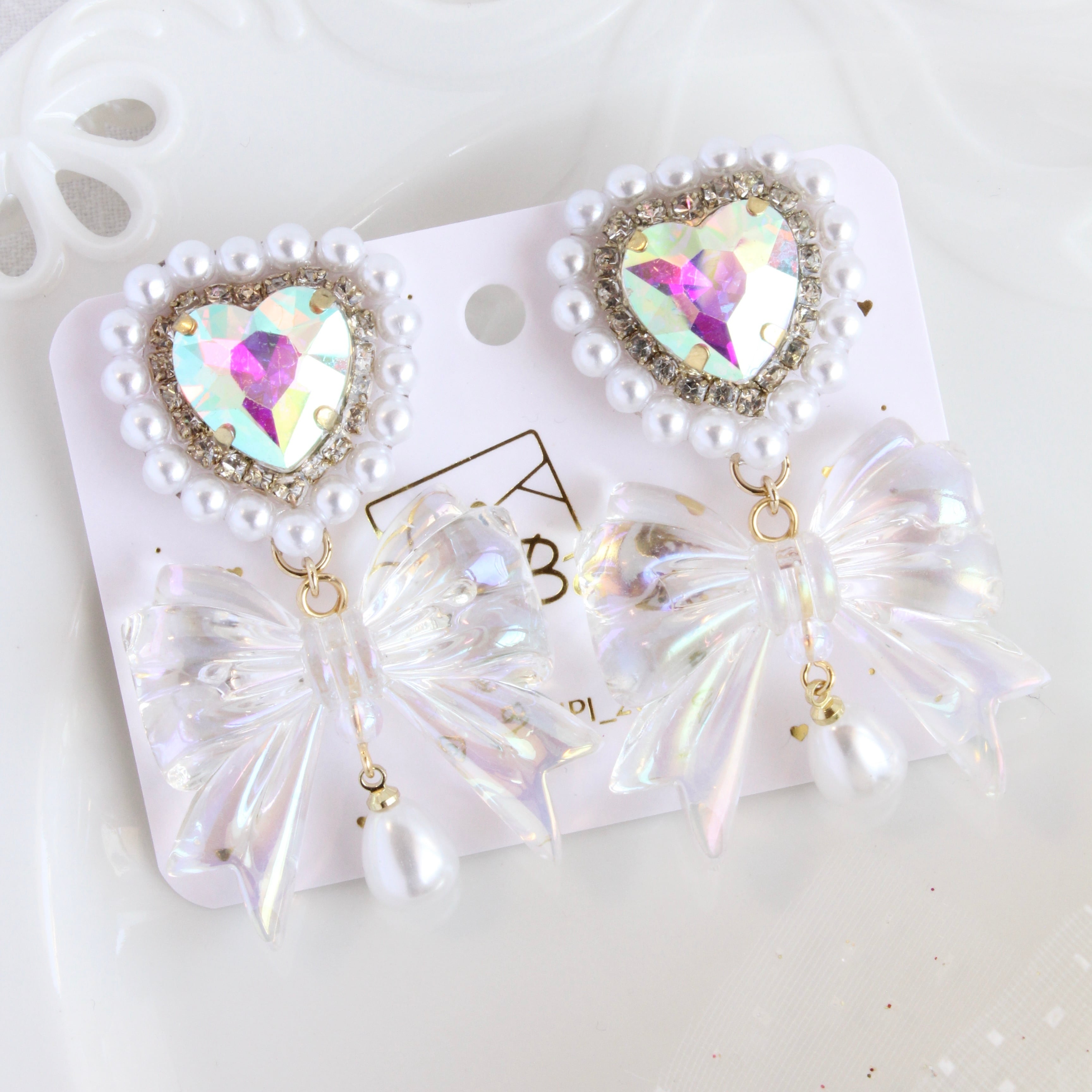 ハートビジューちゅるんリボンピアス・オーロラ