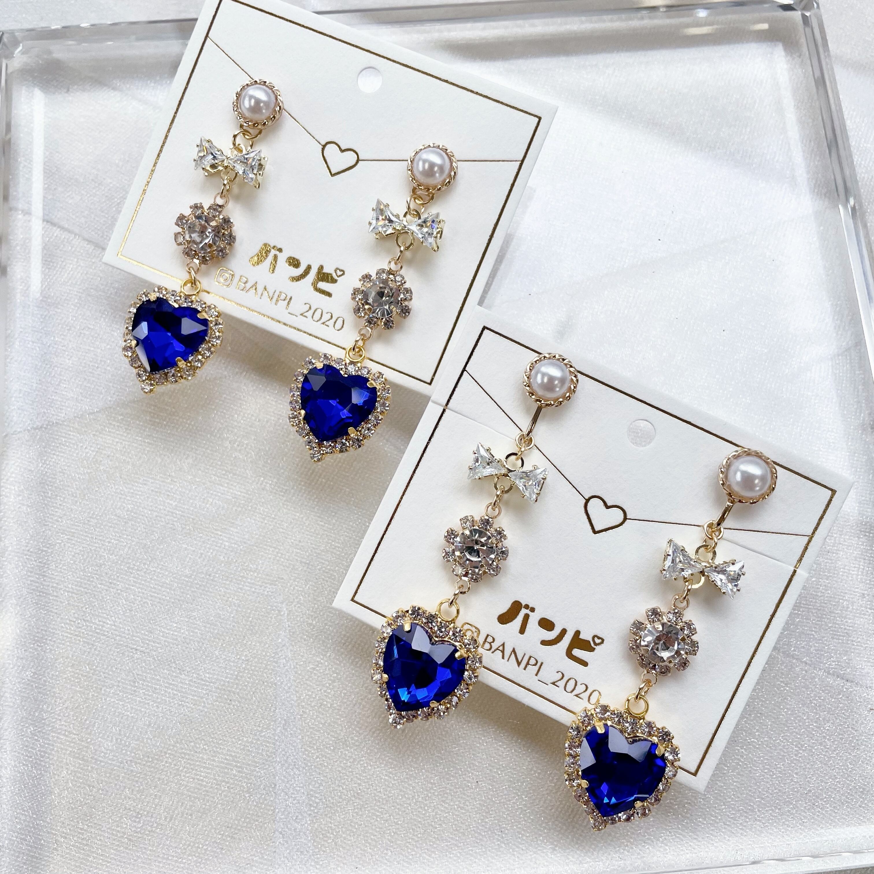 ビジューキラキラハートピアス・ブルー